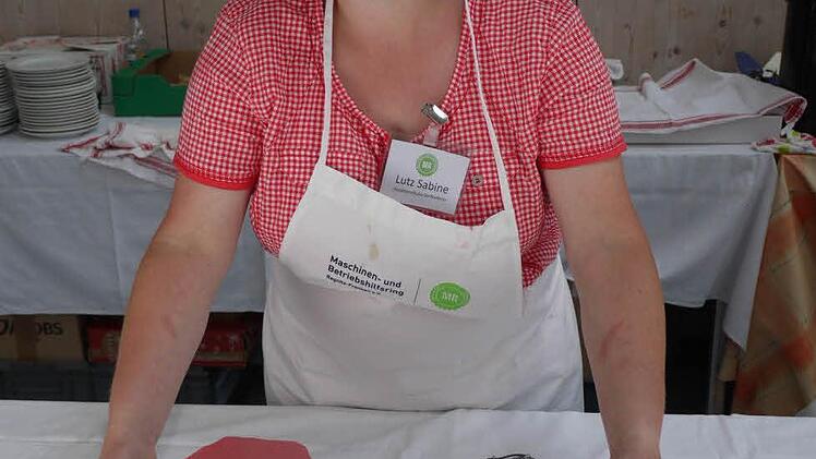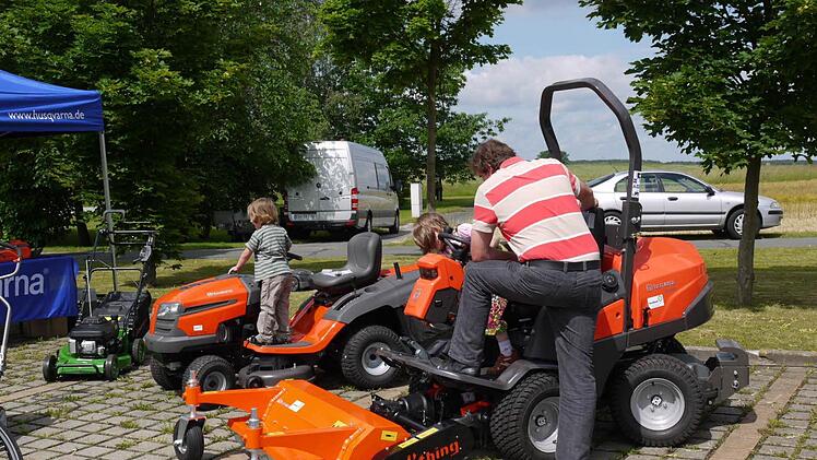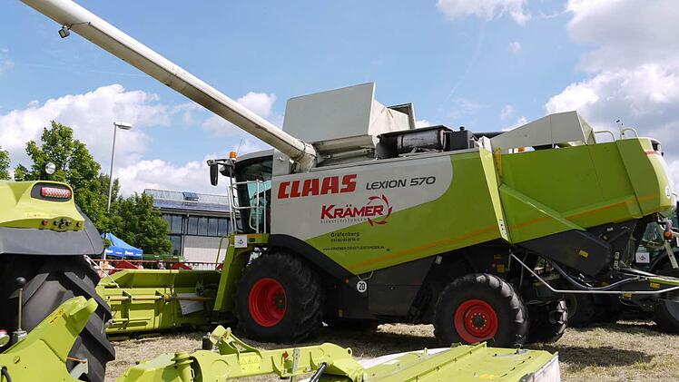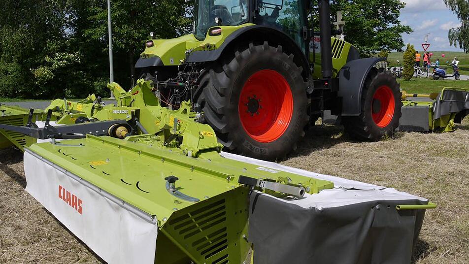Er gibt interessierten Besuchern Auskunft über wahre Riesen unter den Maschinen. Allein der Traktor, ein Claas Arion mit 170 PS, beeindruckt. Sein hinterer Reifen misst gut und gern 1,80 Meter. Angespannt ist eine Mähkombination, deren Mähwerk ausgefahren eine Breite von 8,40 Metern hat.