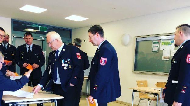 Wahlberechtigt waren alle Kommandanten aus den 75 Feuerwehren und einer Werkfeuerwehr des Landkreises. Mit 60 von 73 Stimmen wurde Matthias Rocca überzeugend wiedergewählt.