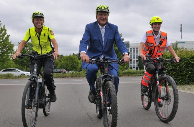 Bayerns Innenminister Joachim Herrmann und der Bereitschaftsleiter des BRK-Bezirksverbands Ober- /Mittelfranken, Johannes Stegmann, sind sich einig: "Unsere Dienstfahrräder haben sich außerordentlich bewährt und sind hervorragend für Einsatzzwecke geeignet." Das machten Herrmann und Stegmann in Erlangen bei der Vorstellung der Erfahrungen mit Dienstfahrrädern deutlich. Deshalb sollen bei der Bayerischen Polizei und beim BRK in Zukunft verstärkt Zweiräder genutzt werden.