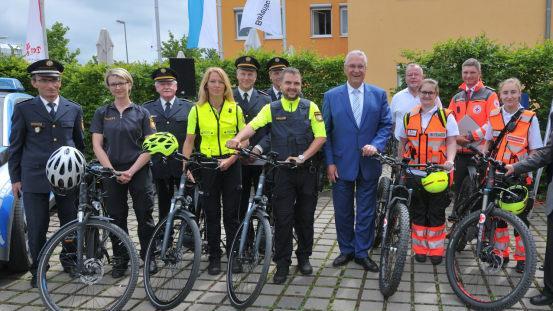 Dabei setzen die Bayerische Polizei und die BRK-Bereitschaften in Ober- und Mittelfranken auch auf E-Bikes. Aktuell hat beispielsweise das Polizeipräsidium Mittelfranken für die Polizeiinspektion Erlangen neue E Bikes angeschafft, um sie im Dienstalltag zu testen. Laut Herrmann verfügt die Bayerische Polizei derzeit bayernweit über rund 800 Diensträder. "Vor allem im städtischen Bereich, wo bei stockendem Verkehr das Fahrrad schneller und wendiger als ein Pkw ist, oder in Grün- und Parkanlagen haben wir ausgesprochen gute Erfahrungen gemacht", so der Minister. "Außerdem haben unsere ,Fahrrad-Cops' eine besondere Nähe zu unseren Bürgerinnen und Bürgern und leisten wertvolle Präventionsarbeit. Sie vereinen die Vorteile einer jederzeit ansprechbaren Fußstreife mit der umweltfreundlichen Mobilität des Zweirads."