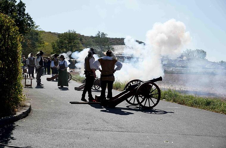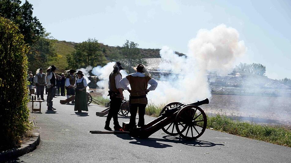 Nach der Eröffnungsrede von Bürgermeister German Hacker (SPD) machte die historische Stadtwache aus Höchstadt mit weithin hörbaren, donnernden Böllerschüssen auf den "Tag der Vereine" aufmerksam. "Kein Wunder, dass der Krieg 30 Jahre dauerte", kommentierte Sänger Bernhard Wilfer von Faded Glory das zeitaufwendige Laden und Stopfen der Böllerkanonen.