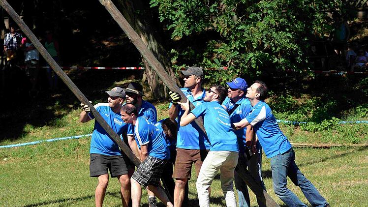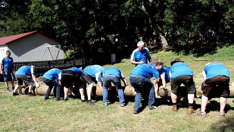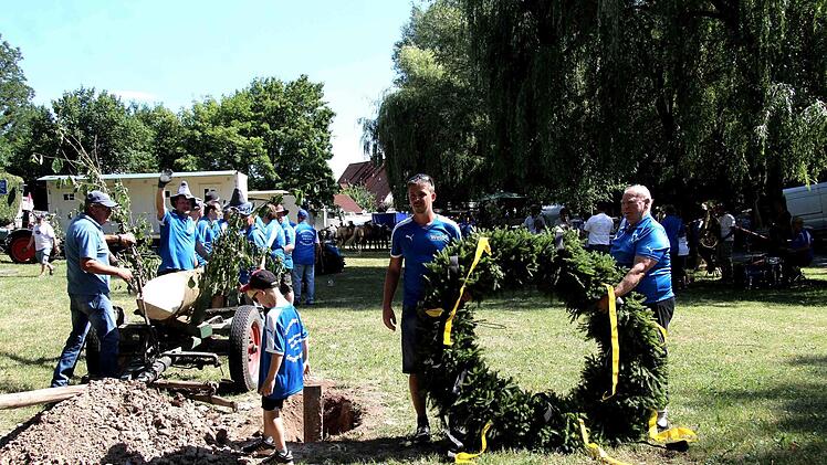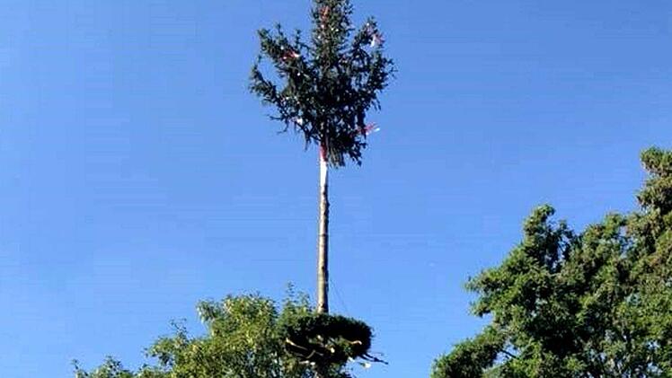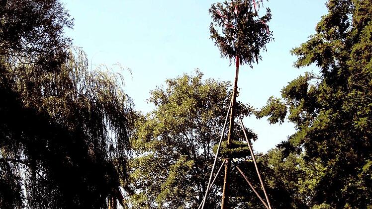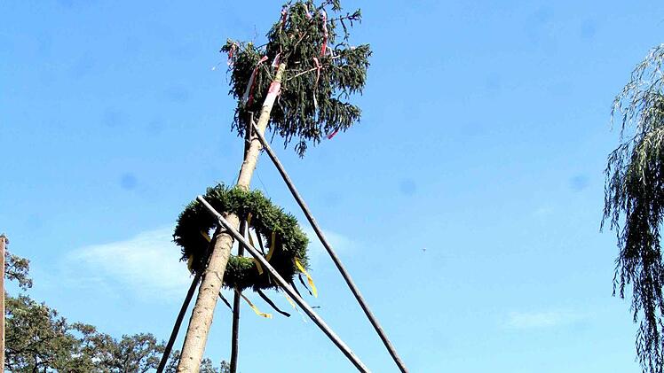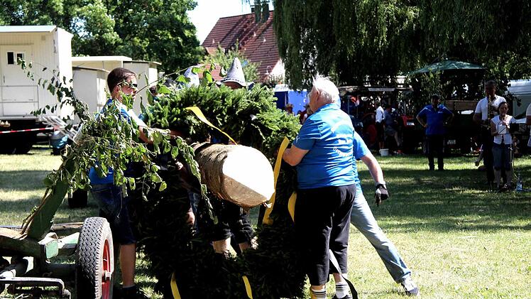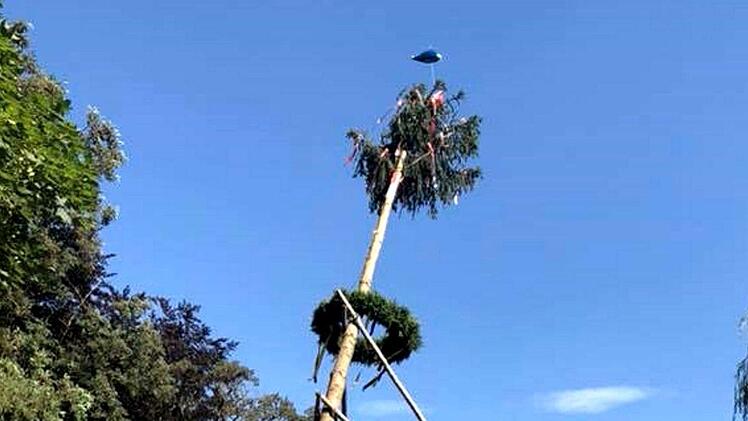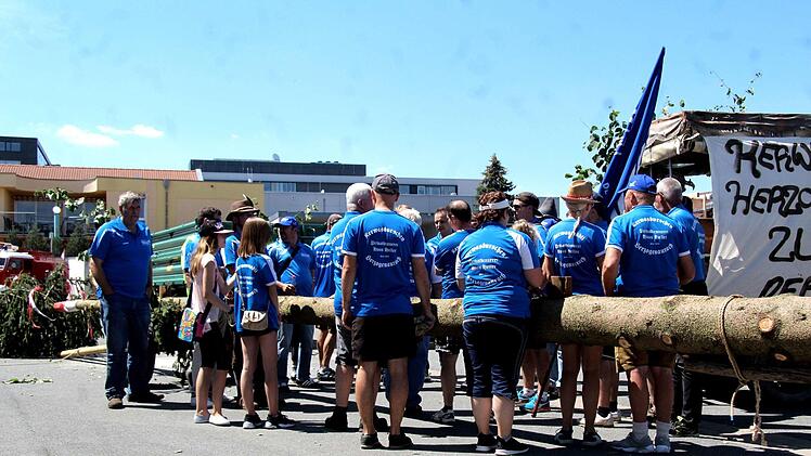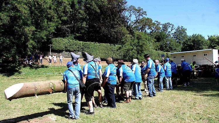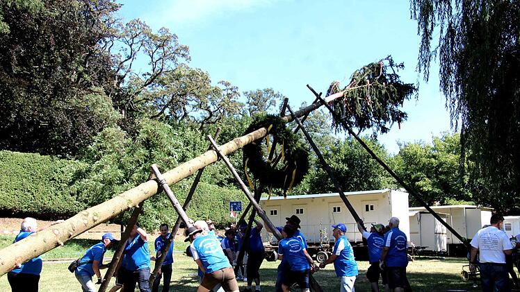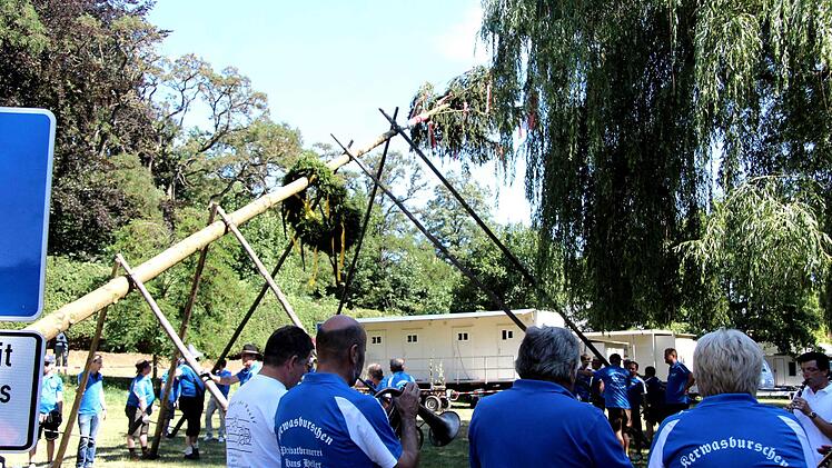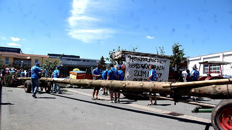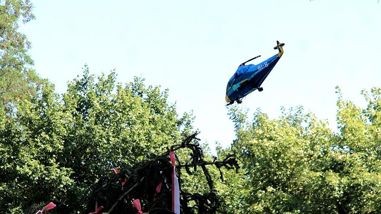 Unter dem Kommando von Armin Gumbrecht und der Trillerpfeife seines Bruders Jürgen wurde Baum in die Höhe gehievt. Der Hubschrauber an der Spitze des Baumes, zusammen mit der Frankenfahne, hatte dabei wohl eher einen symbolischen Charakter, denn es war nur ein bunter Luftballon.