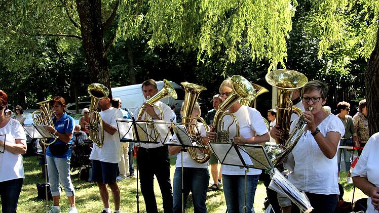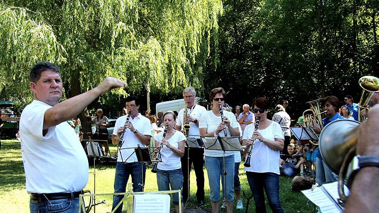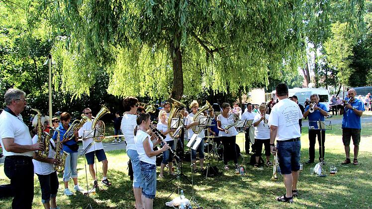Da es auf der Wiese hinter dem Spielplatz am Weihersbach in den Vorjahren immer mal Probleme mit abgestellten Fahrzeugen gab, hatte die Stadt vorgesorgt und zog Absperrbänder. Dort warteten dann auch bereits die Ehemaligen der Stadtjugendkapelle, die das Aufstellen musikalisch begleiteten und die zahlreichen Zuschauer unterhielten.