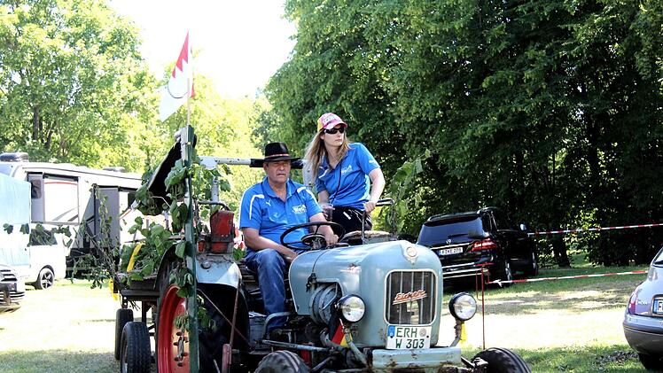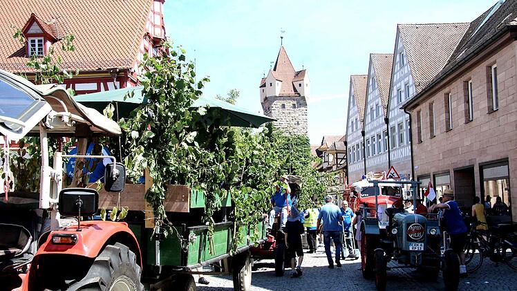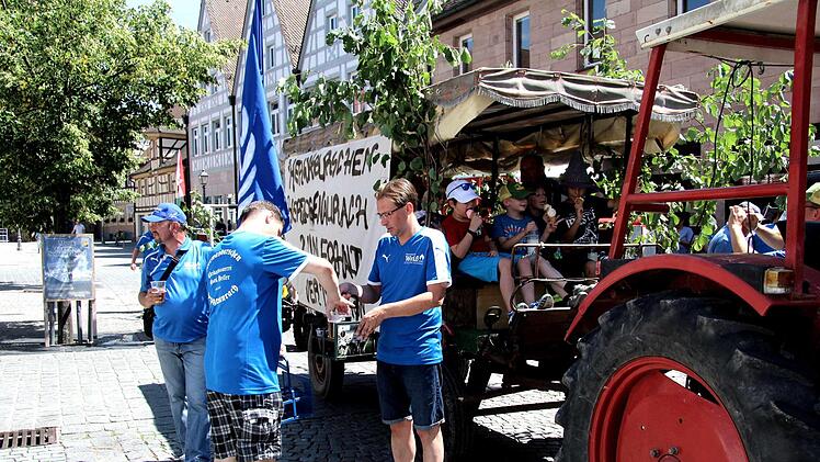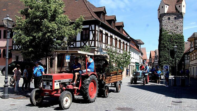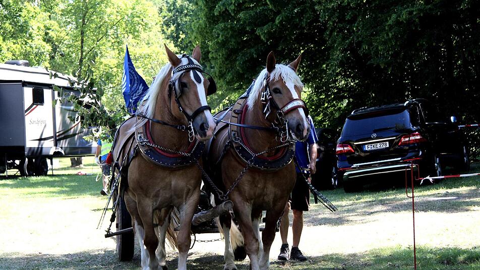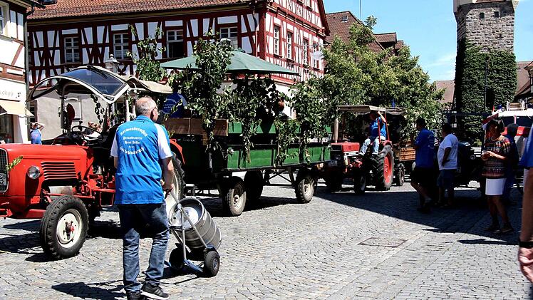 Traditionell wird Baum vom Großenseebacher Herbert Müller und seinen Pferden Marille und Mirabell zum Festplatz gebracht, nicht ohne den obligatorischen "technischen Halt" vor der Brauereigaststätte Heller. Der Zug mit Pferden, Baum, Bulldogs und dem Oldtimer-Feuerwehrauto sowie Blasmusik sorgten natürlich für Aufsehen in der Stadt. Mirabell und Marille ließen sich bei den Stopps die Streicheleinheiten gerne gefallen. Ein weiterer Halt wurde am Haus Martin an der Würzburger Straße eingelegt, denn dort wohnt seit kurzem "Kirchweih-Oldie" Reser und da waren ein Ständchen und einige Kerwaslieder eine Selbstverständlichkeit.