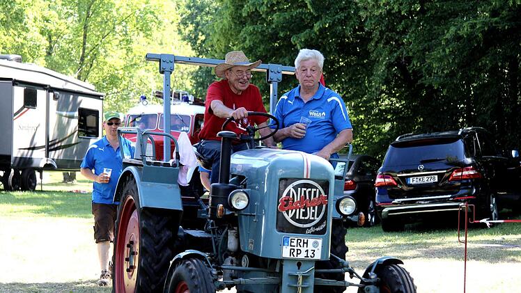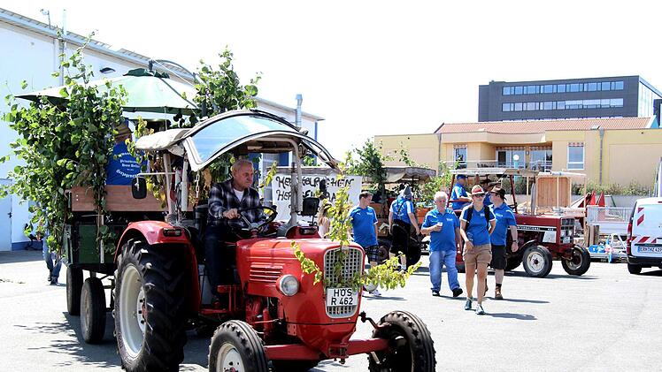 Auf dem Bauhofgelände versammelten sich die Kerwaburschen, dazu das alte Tanklöschfahrzeug und die historischen Traktoren mit den Wagen für Musiker und dem Bier, das unterwegs an die am Straßenrand stehen Zuschauer gegen einen Obolus verteilt wurde. Vor dem Abmarsch gab es die obligatorische Sicherheitsbelehrung für die Kerwaburschen und zur Verkehrsregelung.