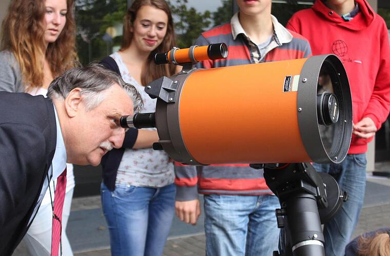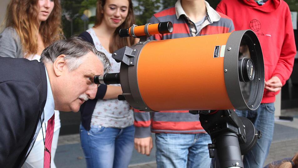 Eberhard Irlinger lässt es sich nicht nehmen, einen Blick durch das neue Teleskop zu wagen. Sonnenflecken wird der Landrat zwar am regnerischen Vormittag in Spardorf nicht gesehen haben, mit dem Verpachtungskonzept beweist der Kreis jedoch Weitblick und Zukunftsorientierung.