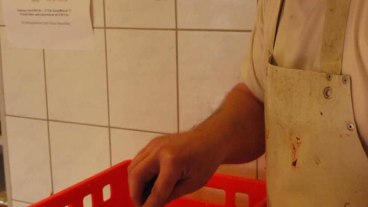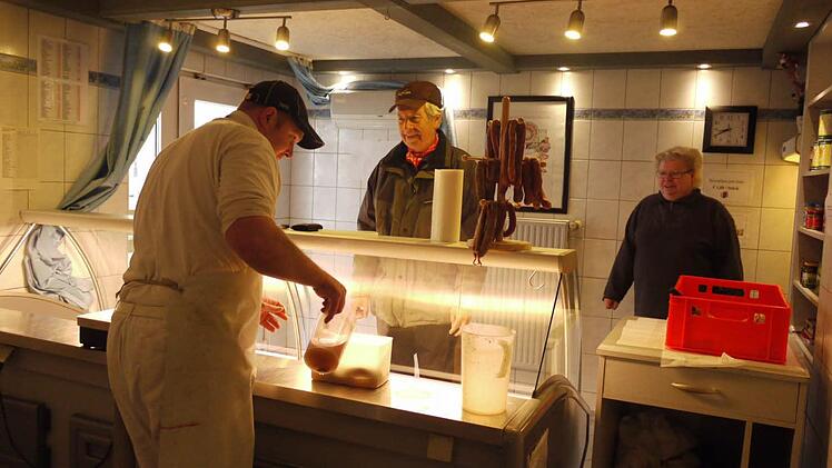 "Was darf's sein, Herr Faaß, wie immer?", fragt Metzgermeister Karl-Heinz Baumüller den älteren Mann, der eine Plastikbox auf die Ladentheke stellt. Gekochter Bauch, Blut- und Leberwürste und Wurstsuppe will der Kunde. "Das essen wir gern, darum beeile ich mich, um früh dran zu sein", setzt Kunde Faaß erklärend dazu.
