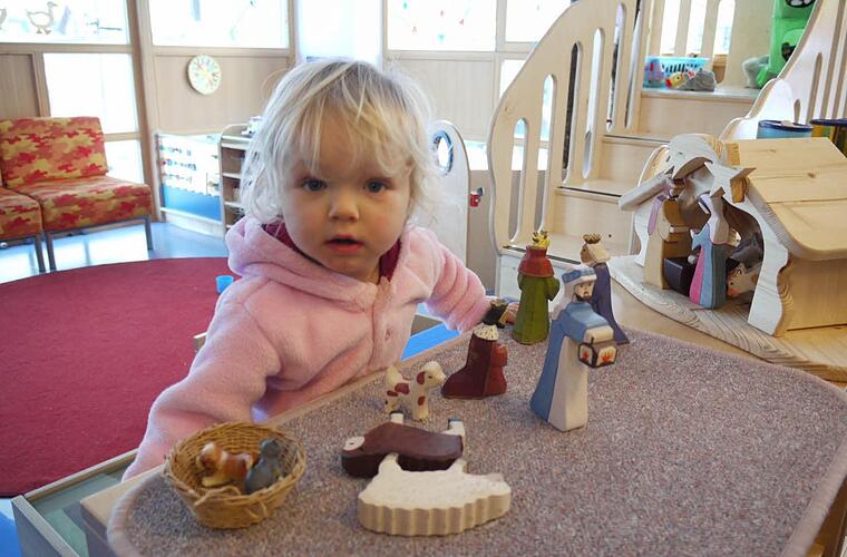 Freya soll demnächst in eine Kindertagesstätte gehen. Mit ihren Eltern schaut sie sich im evangelischen Montessori-Kinderhaus um. In der Krippengruppe hat sie die bunten Holzfiguren bei der Weihnachtskrippe entdeckt. Vorsichtig steigt sie die schiefe Ebene hinauf, um auf Augenhöhe zu Schafen und Königen zu gelangen. "Wau-Wau", ruft sie und hebt den Hund aus dem Körbchen. Dann wird die Katze begutachtet und dann...