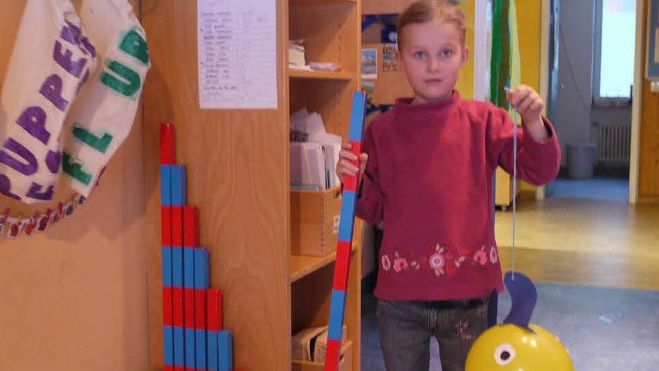 Die Zweijährige führt vor, was die italienische Pädagogin Maria Montessori Polarisation der Aufmerksamkeit genannt hat: Freya ist so sehr konzentriert auf ihre Figuren, dass sie alles ringsum kalt lässt. Dazu hat Montessori eine ganze Reihe von sehr nüchtern anmutenden "Spielsachen" entwickelt. So sollen auch nach den Vorstellungen der Röttenbacher Montessori-Erzieherinnen die Welt eigenständig entdecken. Mit Hilfe der Erzieherinnen.