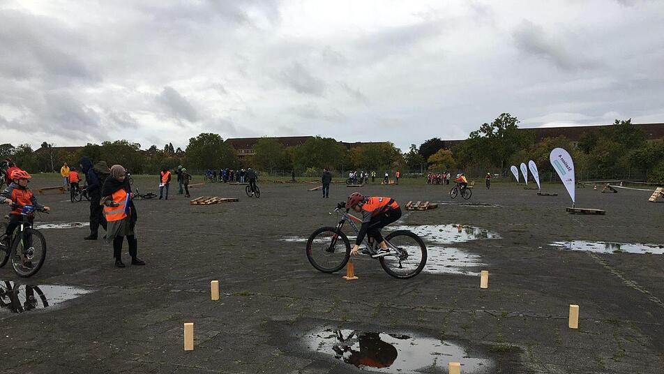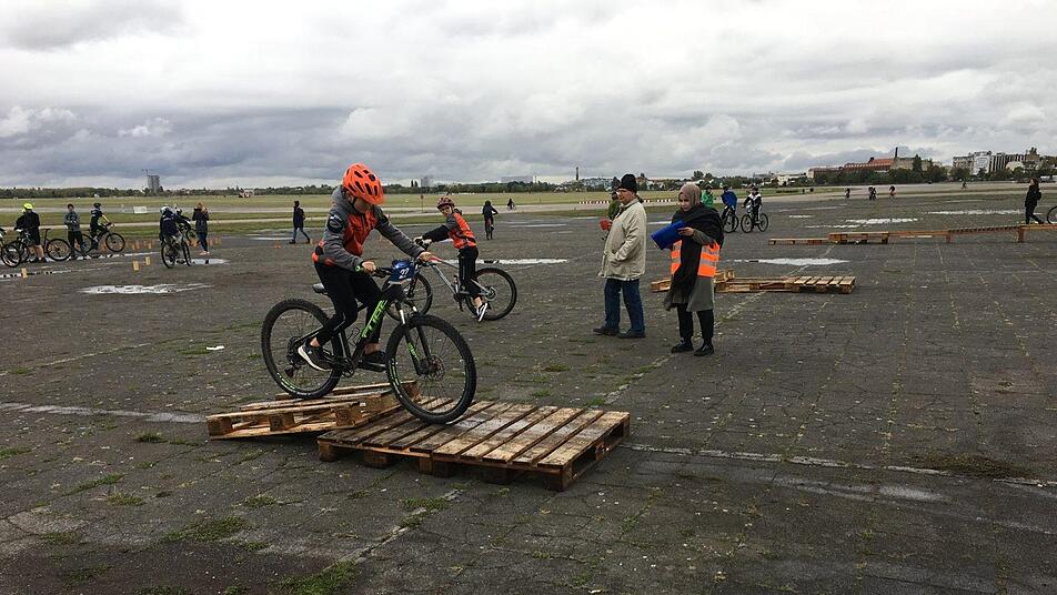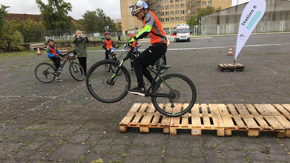 Später ging es darum, über Paletten zu fahren und mit einem Wheelie - dabei wird das Vorderrad hochgezogen - herunterzufahren oder mit dem Mountainbike durch eine Klötzchengasse zu fahren, ohne diese umzuwerfen. Abschließend mussten die Schüler noch über eine Wellenbahn fahren. Für jeden Fehler bekam man Strafsekunden, welche im anschließenden Rennen aufaddiert wurden.