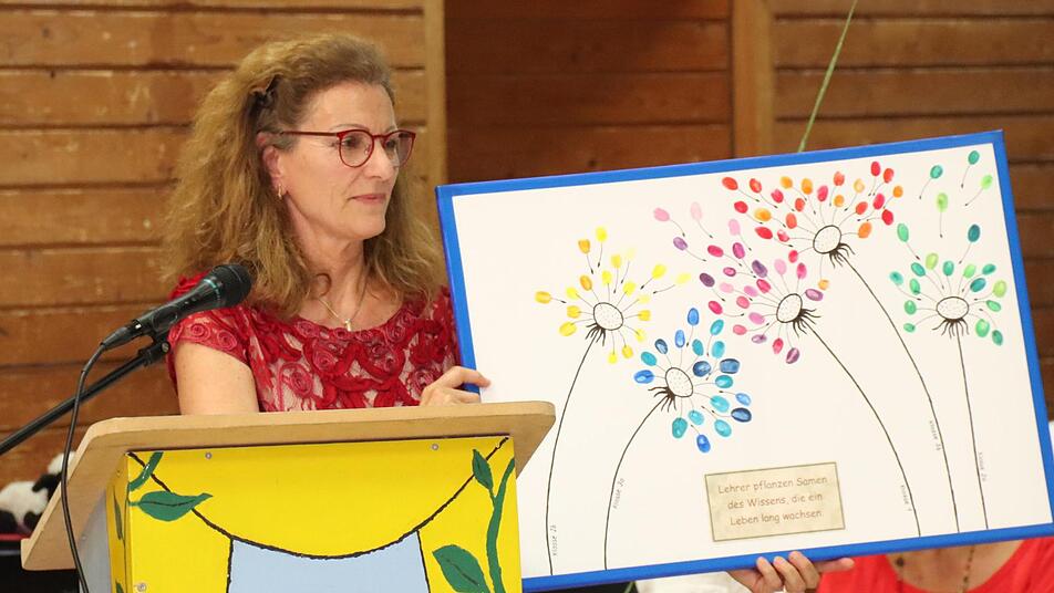 Die Kollegen Johannes Kügel und Beate Ehbauer-Dörres schauten im Rückblick hinter einige Türen, durch die ihre Chefin gerne gegangen ist, und schenkten ihr dann gemeinsam mit den Schülern ein Feenhäuschen aus einem Baumstamm mit Rädern. "Hinter der Türe sind deine Feen", erklärte Beate Ehbauer-Dörres. Ein langjähriger Freund noch aus der Seminarzeit, Klaus Wenzel, Ehrenpräsident des Bayerischen Lehrerverbands, empfahl ihr, beim Projekt "Betreutes Nichtstun" einzusteigen. Die Schüler der Klassen 4a und 4b mit Esther Ernst und Andrea Lemke führten einen Abschiedsrap vor. Als Lehrerin Karin Hofmann "Memories" aus Cats sang, herrschte ergriffene Stille in der Aula. Zum Abschluss stürmten alle Schüler auf die Bühne und sangen noch einen Rausschmeißer "Komm lass das nie zu Ende gehen", bevor bunte Luftballons durch die Halle flogen.