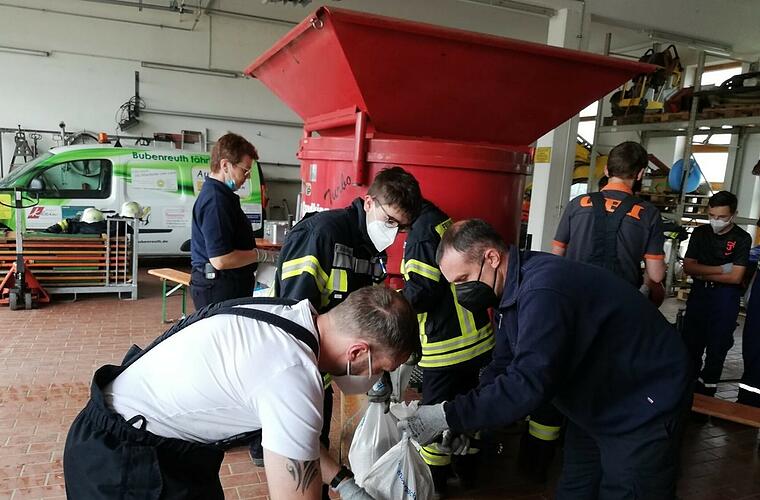 Parallel zu der Verteilung wurde die Sandsackfüllanlage durch die Feuerwehr Bubenreuth in Betrieb genommen, um eine kontinuierliche Sandsackversorgung gewährleisten zu können. Federführend für die Sandsacklogistik ist mit der definierten Örtlichkeit des Bauhofs, die Freiwillige Feuerwehr Bubenreuth zuständig. Dort wird die dafür benötigte Sandsackfüllanlage vorgehalten.