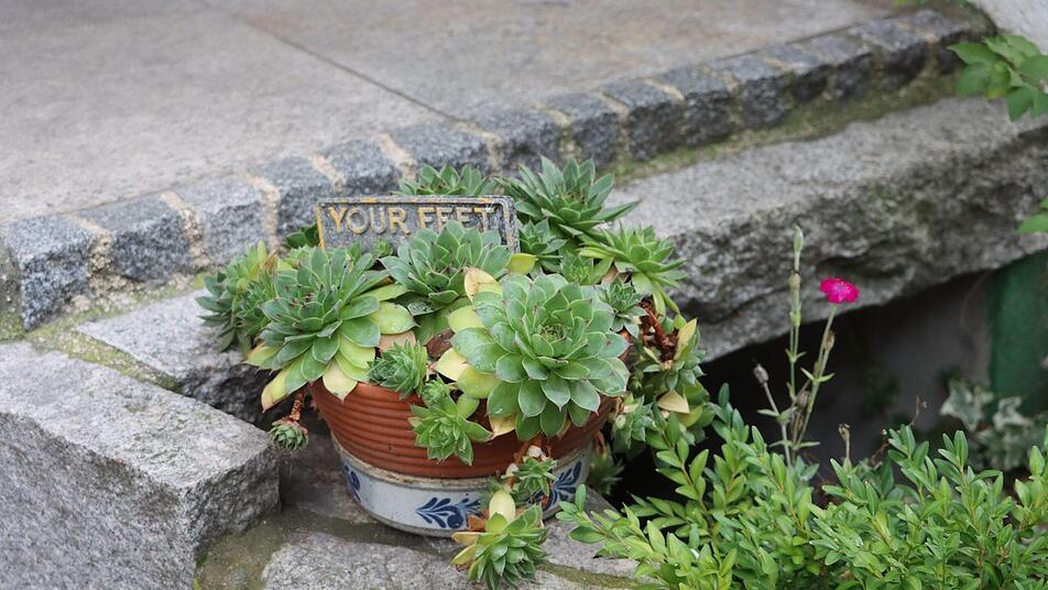 "Besonders in einem kleinen Garten muss man platzsparend gärtnern, aber das geht auch naturnah", betont Kerstin, die besonders ihre Hauswurz-Töpfe liebt, die auf der Haustreppe verteilt sind. Die Hauswand schmückt eine Spalierbirne, blühender Efeu rankt am Gartenzaun in die Höhe und Weintrauben hängen am Garagentor verlockend über dem Kopf.