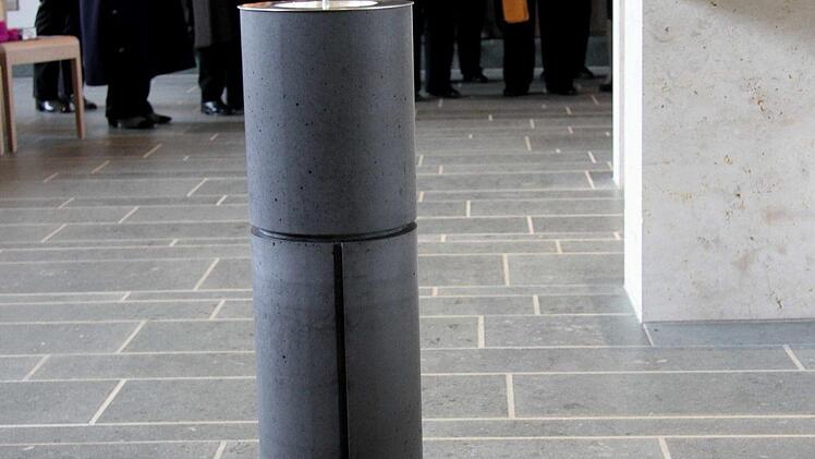 Den Osterleuchter in Form einer runden Säule fertigte die Künstlerin aus dunkelgrauem Beton. Wie die Künstlerin beschreibt, befinden sich in seiner Oberfläche eine Schattenfuge, die quer verläuft, und drei Schattenfugen, die längs verlaufen und so dem Leuchter seine Proportionen verleihen. Auf die Oberseite legte die Künstlerin eine Schale aus Silber, in der die Osterkerze ihren Platz findet. Die Schale schützt den Leuchter vor dem Kerzenwachs und kann zum Reinigen herausgenommen werden.
