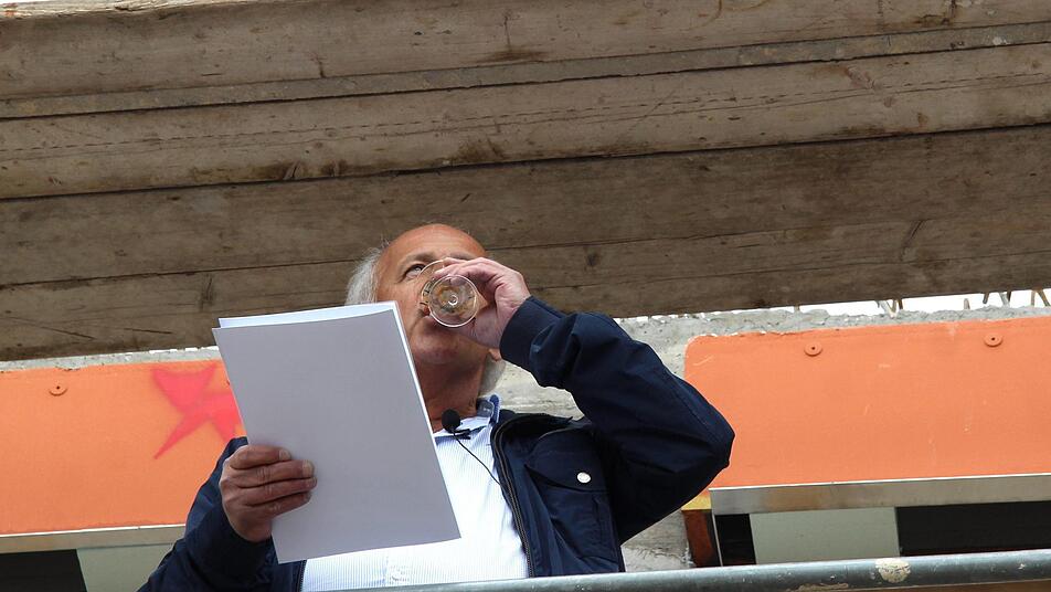 Wie Quandt noch hervorhob, sei der Bau aufgrund des Fleißes der Baufirma bis jetzt im Zeitplan sowie im Kostenrahmen. Er konnte den Baufortschritt täglich beobachten, denn sein Büro befindet sich schräg gegenüber. Dem Polier und Geschäftsführer Adam Hofmann der Baufirma GBG war es vorbehalten, den Richtspruch zu halten und auf Planer, Mitarbeiter und Hausherren ein Glas zu leeren.