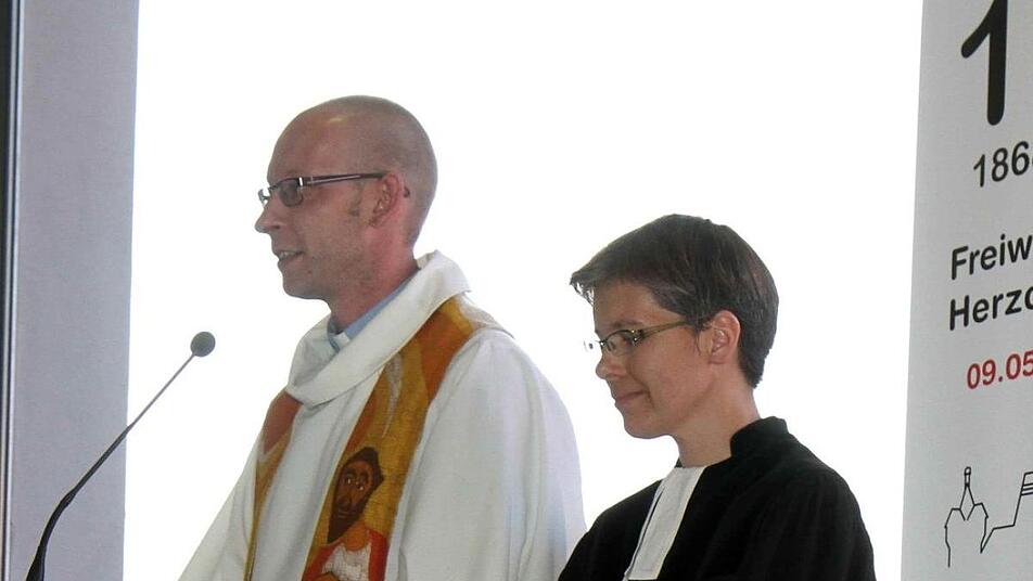 Pfarrerin Andrea Schäfer und Kaplan Sebastian Schiller baten um den Segen für die Feuerwehrleute, dass sie gesund von ihren Einsätzen zurückkommen mögen. Beide weihten die aufgereihten Fahrzeuge.