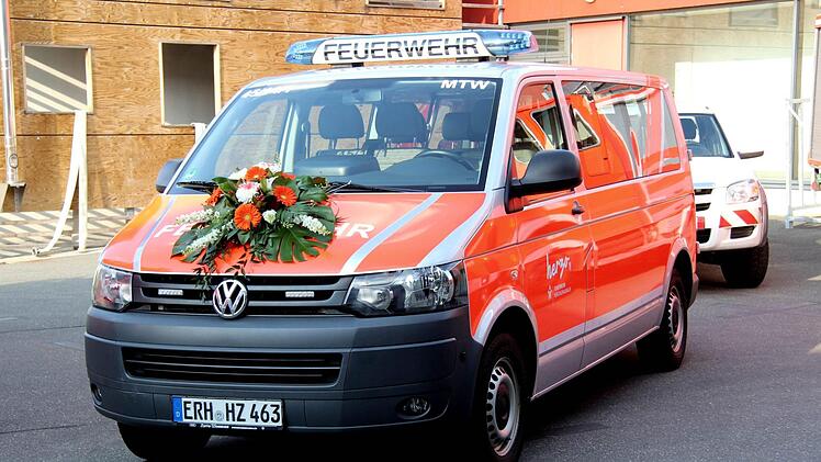 Vor der Halle aufgereiht standen die drei Fahrzeuge: das HLF 20, ein VW Tiguan als Kommando- und Einsatzleitwagen, ein MTW (Mannschaftstransportwagen) sowie ein Anhänger "Flughelfer" mit Löschwasser-Außenlastbehälter für Hubschrauber. Wobei der MTW nicht neu ist, sondern ein Fahrzeug der Stadt und von der Feuerwehr zum Feuerwehreinsatz umgerüstet wurde.