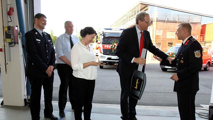 "Das ist heute mehr als eine Fahrzeugweihe", erklärte Bürgermeister German Hacker zu Beginn der Feierstunde in der Feuerwache. Er musste noch einmal zurück ins Rathaus radeln, denn er hatte den symbolischen Schlüssel vergessen. Die Besucher konnten sich dann auch live überzeugen, wie schnell ein Löschzug die Feuerwache verlässt. Mitten in der Begrüßung schlugen die Funkmelder Alarm und drei Löschfahrzeuge sowie die Drehleiter rückten zu einem Brandmeldereinsatz aus. "Ich hoffe nicht, dass es ein Landkreisgebäude ist", meinte Landrat Alexander Tritthart. Das war es dann aber doch, nämlich die Containeranlage an der Eichelmühlgasse. Es war ein Fehlalarm.
