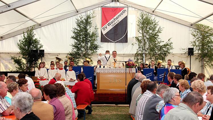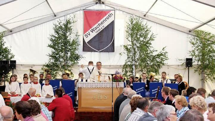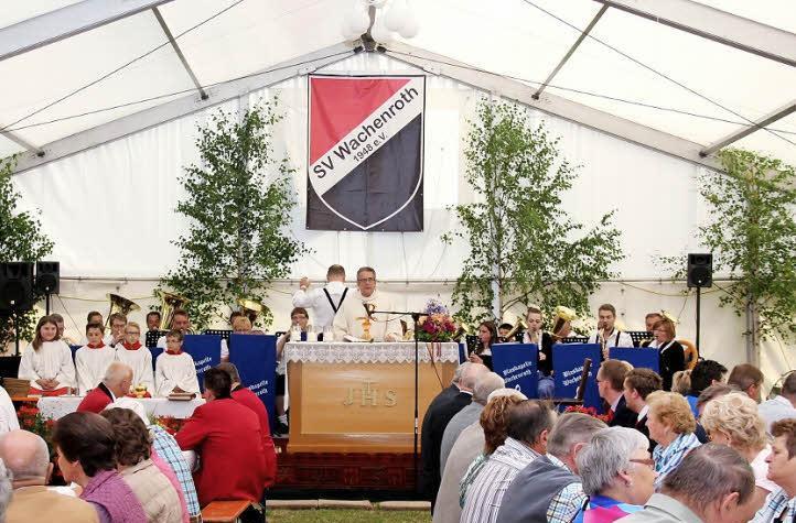 Zum Gottesdienst hatten sich Ehrengäste wie Ehrenvorstand Peter Schmitt und Altbürgermeister und Ehrenbürger Hans Philipp sowie alle Gäste aus Wachenroth und Umgebung im Festzelt versammelt. Padre Gabriel Ramos Valiente freute sich sehr, dass diese Einweihung mit einem Festgottesdienst verbunden ist und in seiner Predigt ging er auf die Verbindung von Sport mit Kirche ein.
