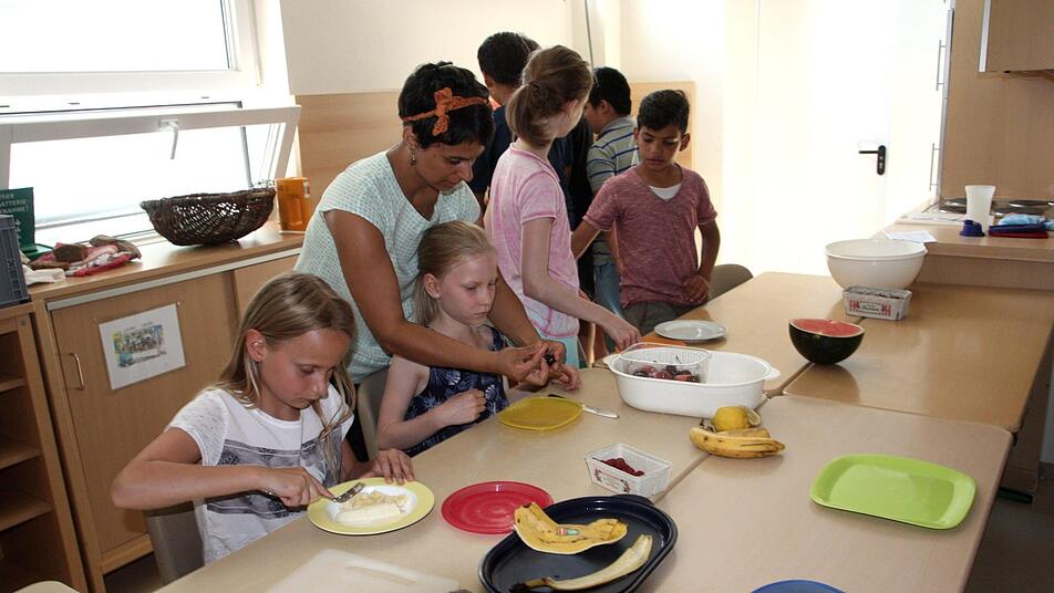 Am Nachbartisch mixten die Kinder zwischenzeitlich einen Nougat-Aufstrich aus Nussmus, Butter und Kakaopulver, natürlich ohne Zucker, gesüßt wurde mit Honig. "Das schmeckt bestimmt besser als Nutella", waren sich zwei Mädchen schon von vorneherein sicher. In der Küche neben dem Klassenzimmer wurde das Frischkorn-Müsli, mit saisonalen und heimischen Früchten zubereitet.