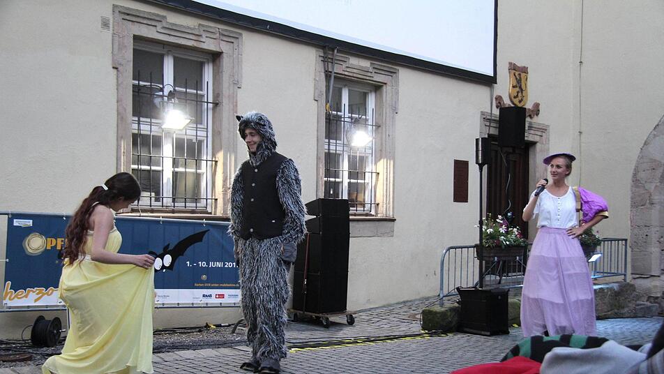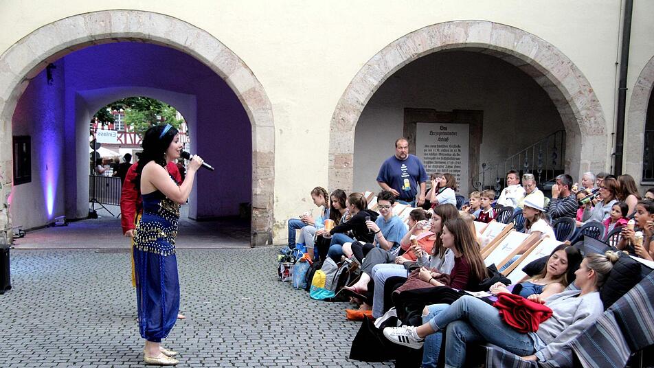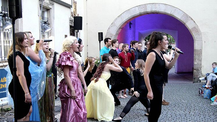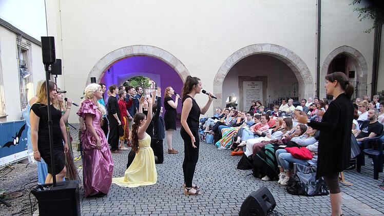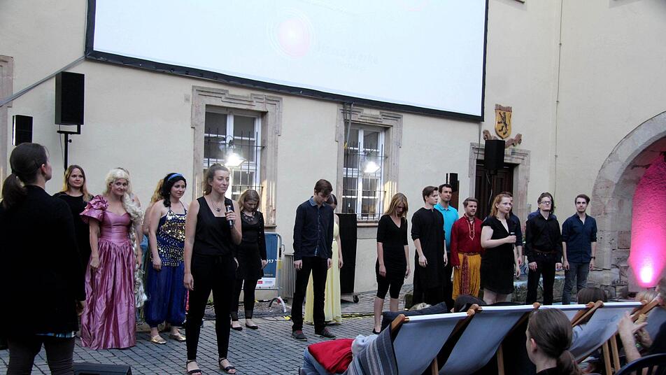 Mit Disney-Hits der Musicalcompany aus Nürnberg wurde im Schlosshof der Filmabend des Mobilen Kinos für "Die Schöne und das Biest" angekündigt. Das Ensemble aus Nürnberg unter der künstlerischen Leitung von Claudia Dörr präsentierte Musik der Extraklasse und machte das Vorprogramm zu einem ganz besonderen Erlebnis für Jung und Alt.