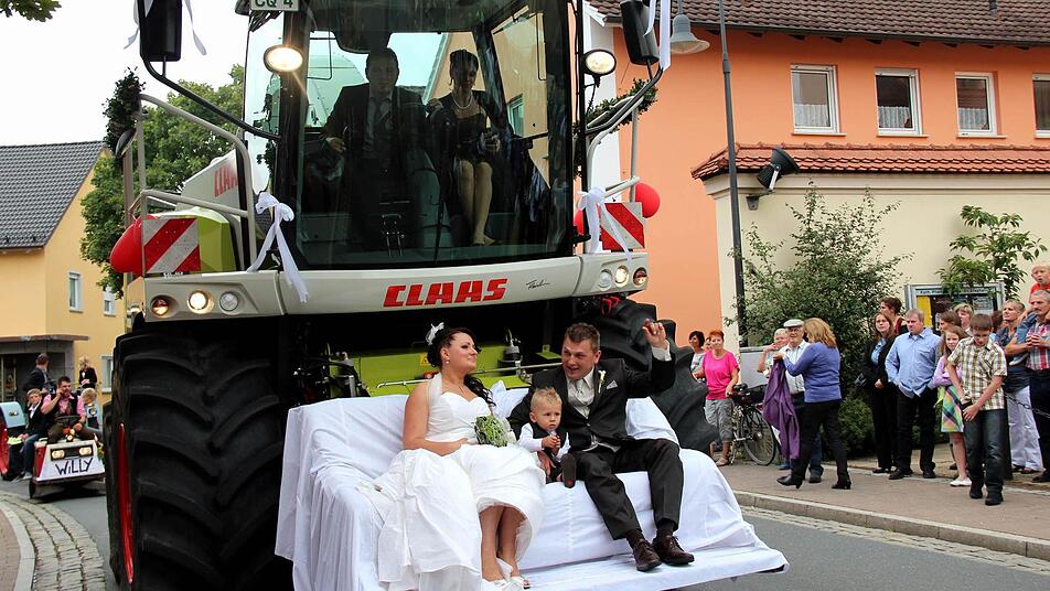 Nicht mit der Kutsche und auch nicht mit einem schicken Auto - nein, mit dem eigenen Maishäcksler ließ sich das Brautpaar Daniel und Michaela Fleischmann zusammen mit dem kleinen Sohn Elias am Samstag Nachmittag zur Hochzeit in die Kirche in Adelsdorf und dann nach Neuhaus zum Feiern fahren. Das bequeme Sofa bot reichlich Platz für die kleine, glückliche Familie. Neun kleinere, aber auch große, bullige Traktoren bildeten die Nachhut.