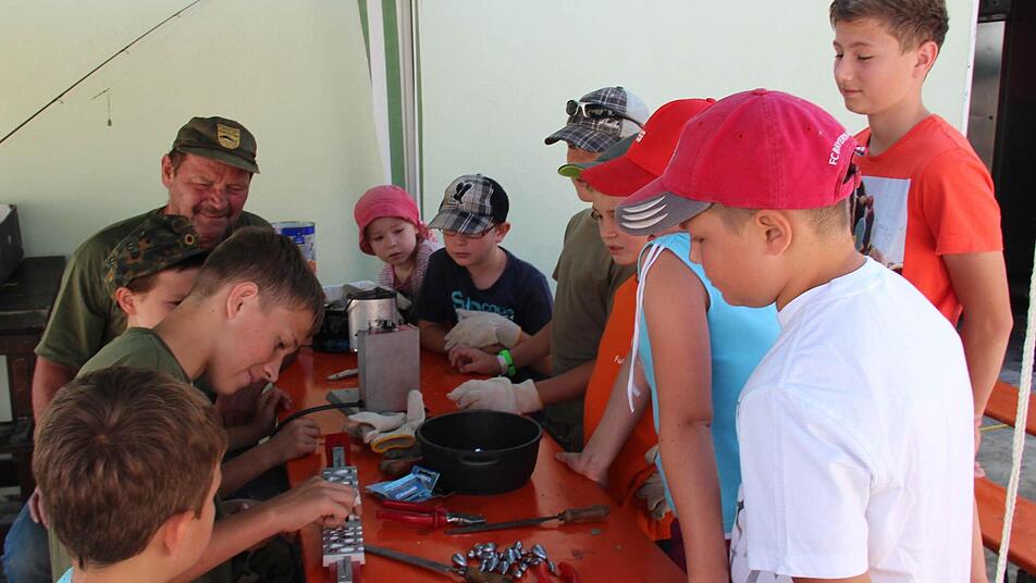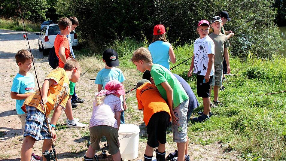 Im Rahmen des Ferienprogrammes wurden sie in Fischkunde, in der Kunst des Angelns und im Bleigießen unterwiesen. Roland Schuldes und Mitglieder der Jugendgruppe leiteten das Programm. Das Blei, das normalerweise im Winter gegossen wird, ist ein Hilfsmittel beim Angeln. Es sitzt 20 bis 30 Zentimeter hinter dem Angelhaken und muss beim Angeln am Grund liegen, während der Haken mit dem Köder weiter oben treibt. Die Bleireste, meist vom Schrotthändler, werden geschmolzen und in Formen gegossen. Das Interesse der 26 teilnehmenden Kinder war groß und am Schluss waren sie mächtig stolz auf ihre selbst geangelten Fische und die gegossenen Bleistücke. Zur Belohnung durften sie diese mit nach Hause nehmen.