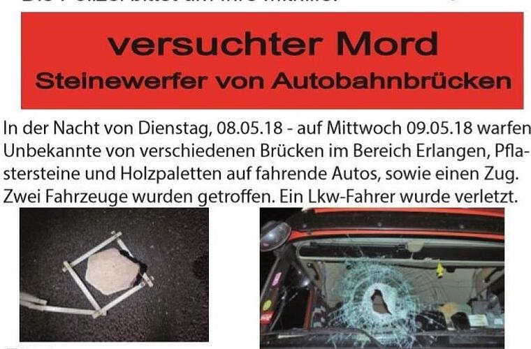Sie warfen warfen große Pflastersteine (ca. 20 x 20 cm) und zwei Europaletten auf fahrende Autos, die auf der A3 und A73 in Baiersdorf (Lkrs. Erlangen-Höchstadt) und Eltersdorf (Stadt