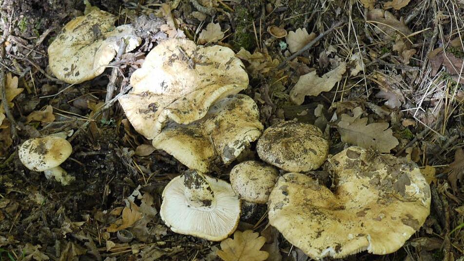 "Pilze haben manchmal schon seltsame Namen", schmunzelt Krautblatter bei einem nächsten Fund. "Der wird Unverschämter Ritterling genannt. Wegen seines intensiven modrigen Geruchs." Eine ganze Scheibe unscheinbar gelblicher, trichterförmiger Pilze freut ihn besonders. Es handelt sich um den Gerippten Ritterling. "Vor 40 Jahren habe ich den mal bei Hombeer gesehen.