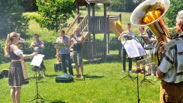 Dann ging es auf einem Anhänger hinter einem Traktor durch die Dörfer. Man spielte zunächst vor der Katharinenkirche in Pretzdorf und dann auf der Straße mitten in Dietersdorf. Zur Mittagszeit fuhr der Wagen zum Spielplatz in Burgweisach, wo die Dorfbewohner Gegrilltes und kaltes Bier anboten, aber erst, nachdem die Posaunisten für sie eine Weile lang musiziert hatten.