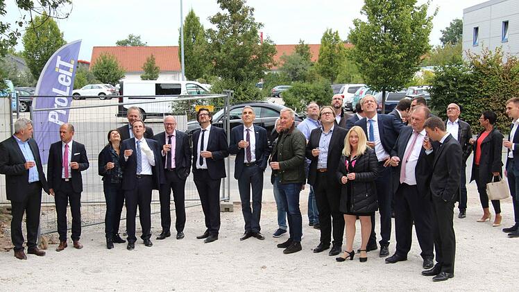 Strahlende Gesichter vor dem Neubau der Firma Proleit an der Einsteinstraße beim Richtfest. In direkter Nachbarschaft zum Firmensitz entsteht auf vier Geschossen eine moderne Arbeitswelt mit rund 250 Arbeitsplätzen. Die neuen Räumlichkeiten werden sich auf einer Fläche von etwa 4500 Quadratmetern erstrecken. Nach der Grundsteinlegung am 11. November 2016 konnte am Freitag mit Gästen aus Politik und Wirtschaft sowie Mitarbeitern Richtfest gefeiert werden.