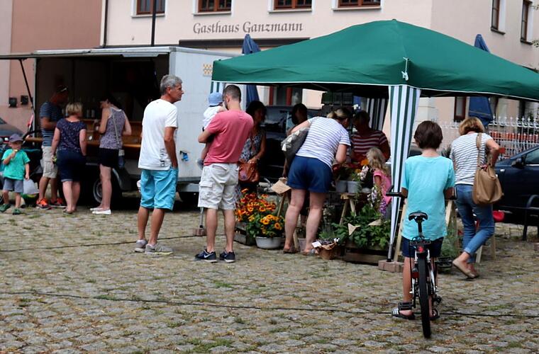 Dunkle, drohende Wolken bauten sich am Donnerstagnachmittag über dem Adelsdorfer Marktplatz auf, ausgerechnet zu Beginn des ersten Wochenmarktes, den Hobby-Imkerin Simone Kirchner aus Aisch auf die Beine gestellt hatte. "Leider hat mich der Obsthändler heute im Stich gelassen", meinte sie etwas enttäuscht. Aber dafür gab es einen Stand mit flüssigem Obst. Verschiedene Schnäpse und sogar Whisky bot Marc Mucha aus seiner "Brennerei beim Schloss" in Hemhofen in seinem Stand an. "Den Markt finde ich klasse", schwärmt Kunde Matthias Birkner. "Ich hab leckeren Schnaps probiert, Honig gekauft und die Blumen finde ich auch gut. Hoffentlich bleibt uns dieser Markt erhalten!".