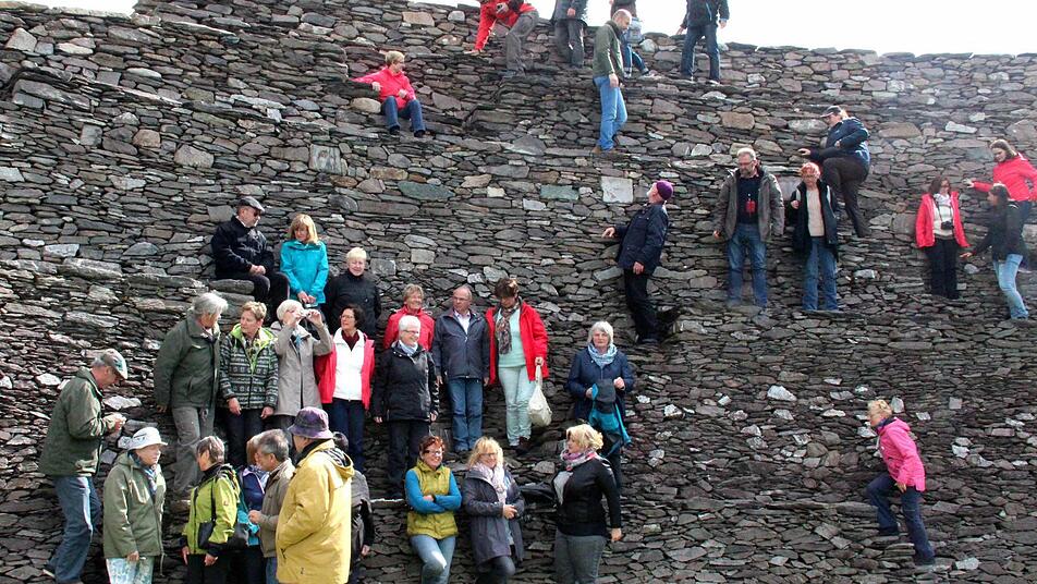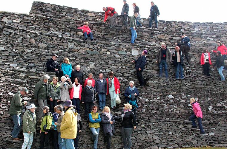 Ist das Wetter regnerisch und stürmisch, kann man im Vorbeifahren in der Sicherheit des Busses die aufsteigende Gischt bewundern. Bei klarer Sicht hatten wir einen irren Ausblicken aufs Meer, den "Schlafenden Riesen", die "Skelligs" und die "Drei Schwestern". Gleich zu Beginn machten wir noch kurz Stopp in einer Art-Gallery am Weg, wo wir schöne kleine Andenken aus Glas (handmade in Ireland und nicht in China! ) bewundern und kaufen konnten. Die kleine Puffins, Hochkreuze, Harfen, Fuchsien fanden reißend Absatz. Diesmal begleitete uns Harald Saul, ein Bekannter, der auf Dingle sein Ferienhaus hat. Die bergige Dingle-Halbinsel ist vor allem in ihrem Westteil von vor- und frühgeschichtlichen Denkmälern förmlich übersät. Wir besuchten das Gallarus Oratory, ein rustikales, frühchristliches Gebetshaus, das in Trockenmauertechnik errichtet ist und aussieht wie ein umgedrehter Schiffsrumpf.
