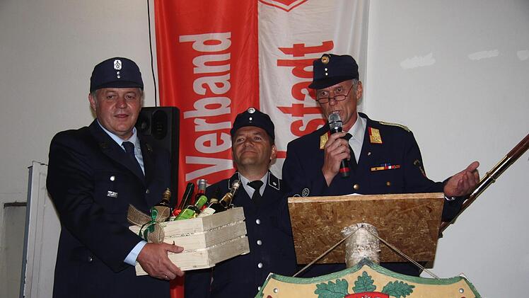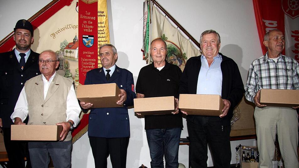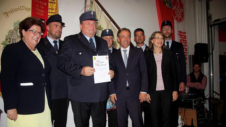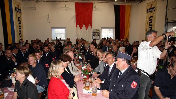 In der Festhalle des Nussel-Hofes konnte Vorsitzender Jürgen Hoffmann Urkunden für insgesamt 950 Jahre Mitgliedschaft und vier neue Ehrenmitgliedschaften überreichen. Außerdem ehrten Landrat Tritthart und Kreisbrandrat Matthias Rocca zwei Feuerwehrleute für 25 Jahre und drei für 40 Jahre aktiven Dienst. Nicht zuletzt ernannte Kommandant Daniel Nussel seinen Vater Walter, der die Freiwillige Feuerwehr über 30 Jahre als Kommandant geführt hatte, zum Ehrenkommandanten.