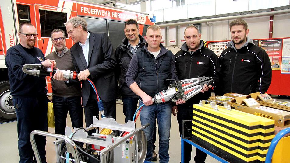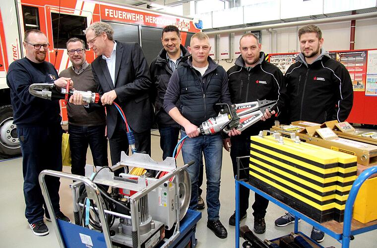 Die Herzogenauracher Wehr hat die Feuerwehrkameraden aus der kroatischen Partnerstadt immer wieder mit Fahrzeugen und Ausrüstung unterstützt. Diesmal überreichten Bürgermeister German Hacker, Kommandant Rainer Weber und Vorsitzender Thomas Geiger sowie die Kommandanten Florian Geinzer und Marcel Zapf der Ortsteilwehr Hammerbach einen Lukas-Rettungssatz an die Feuerwehr aus Nova Gradiška.
