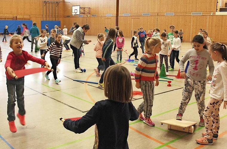 Mike Faulhaber stellte ihnen die Spielgeräte und deren Handhabung vor, und mit Feuereifer probierten die Kids alles aus. Mit viel pädagogischem Geschick lenkte der versierte Sportpädagoge die Schüler, und eine Stunde herrschte in der Turnhalle "geordnetes" Chaos mit Erklärungspausen.