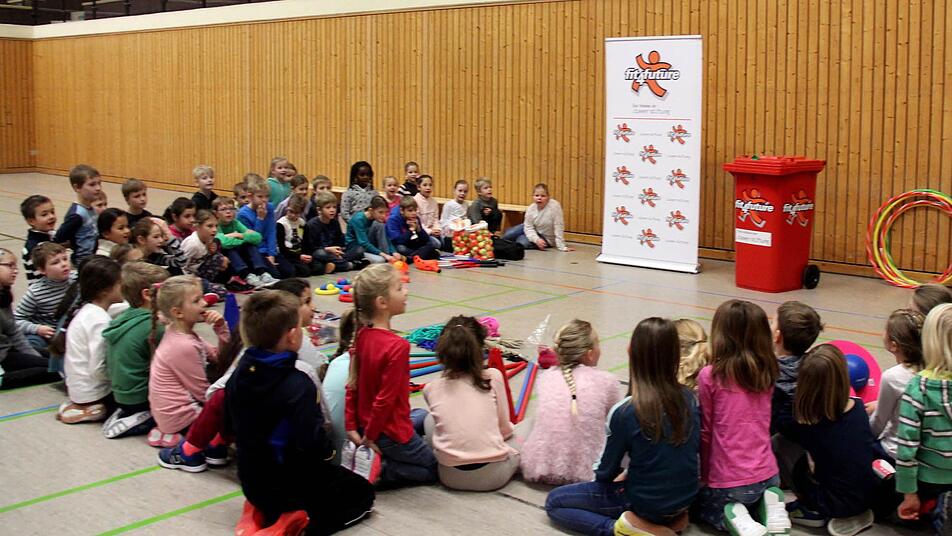 Monika Grünwald (Projektleiterin der Cleven-Stiftung), Mike Faulhaber ("f4f"-Headcoach, Sportlehrer und Ausbilder für Sportlehrer) und Monika Bongers-Rokita (Acquisition Umfeld von der Cleven-Stiftung) waren mit der roten Tonne nach Röttenbach gekommen. Beim Workshop in der Turnhalle waren drei Schulklassen (2a, 2b, 3a) begeistert dabei.