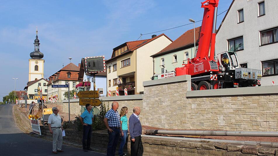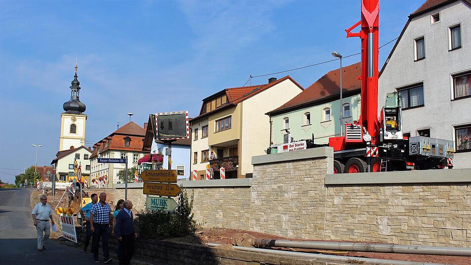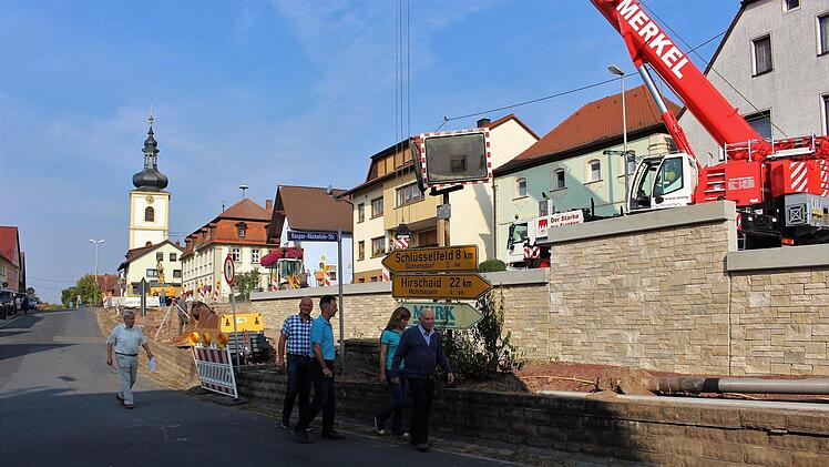 Am Mittwoch noch zog sich ein tiefer Graben durch die Ortsmitte von Wachenroth, am Donnerstag steht schon die neue Stützmauer. Die Arbeiten zur Umgestaltung des Ortskerns schreiten zügig voran: "Wir sind genau im Zeitplan", sagt Ingenieur Robert Ruß vom Höchstadter Planungsbüro Maier.