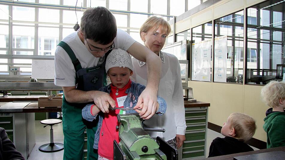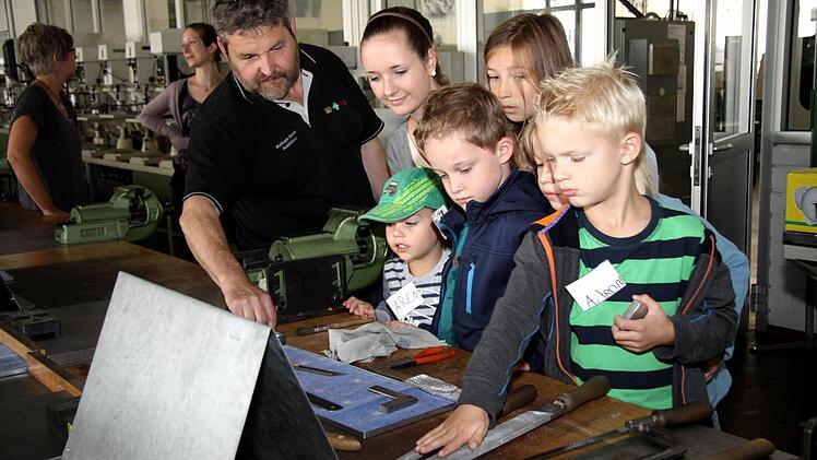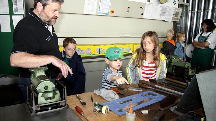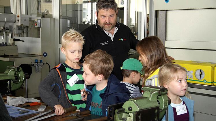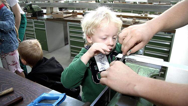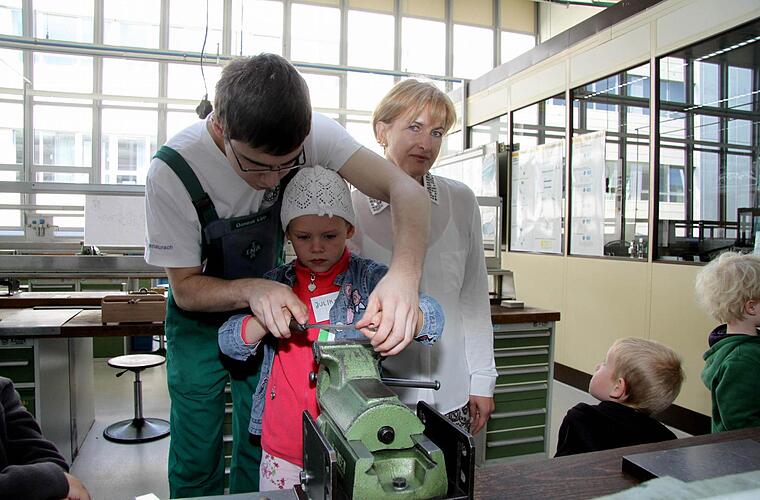 Mit Feuereifer waren die Kinder im Ausbildungszentrum bei der Sache, sie durften am Schraubstock arbeiten, sägen und bohren, denn mit Hilfe der Auszubildenden wurde ein Schlüsselanhänger gefertigt, der sogar mit dem Vornamen des Kindes graviert wurde. Dem erst vierjährigen Phillip gefiel sein erster Versuch noch nicht so richtig, aber mit Hilfe von Christian Beßler wurde der Anhänger am Ende auch ein Meisterstück.