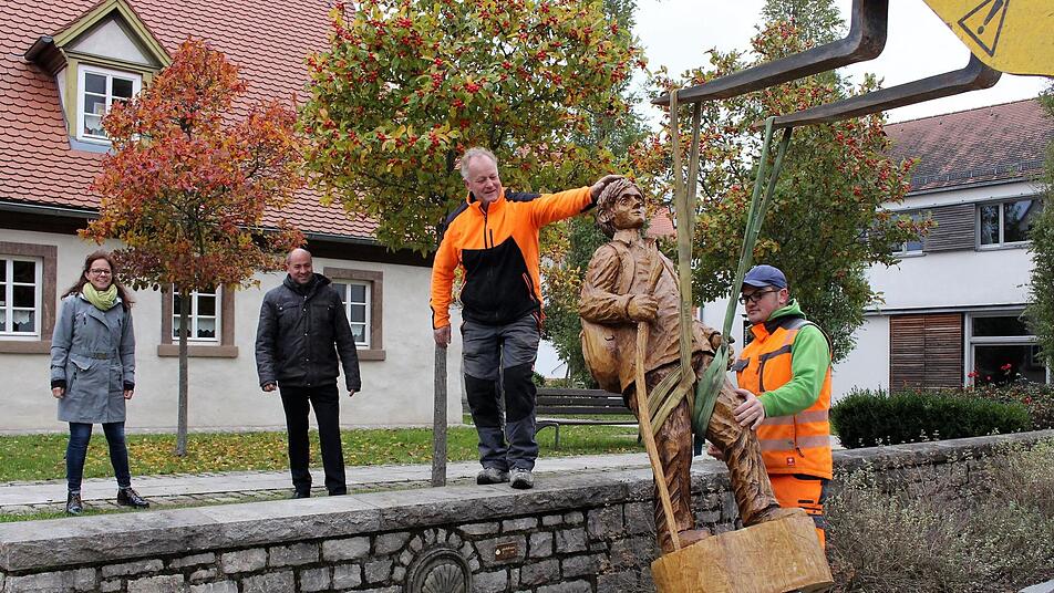 Der Pilger ist eine von drei Holzskulpturen, die beim diesjährigen Winkelmarkt im Juni entstanden sind. Resi Hofmann, Thüngfelder Schnitzerin mit der Kettensäge, und vier ihrer Schnitzerkollegen haben sie unter den Augen der Zuschauer geschnitzt. Anlässlich der Martinikirchweih am Sonntag wird der Schlüsselfelder Skulpturenweg mit den drei Kunstwerken eingeweiht.