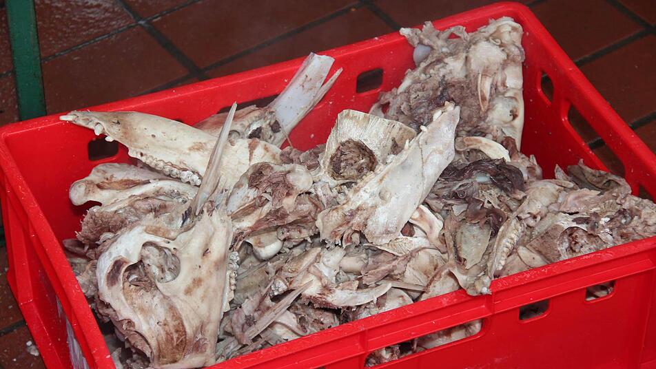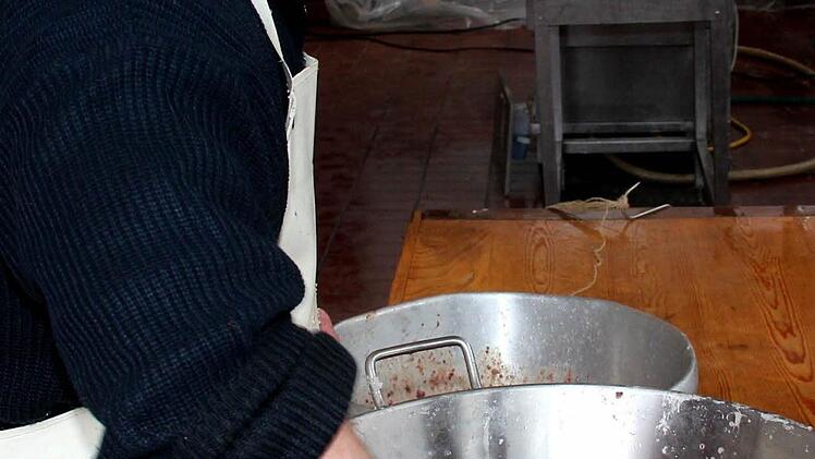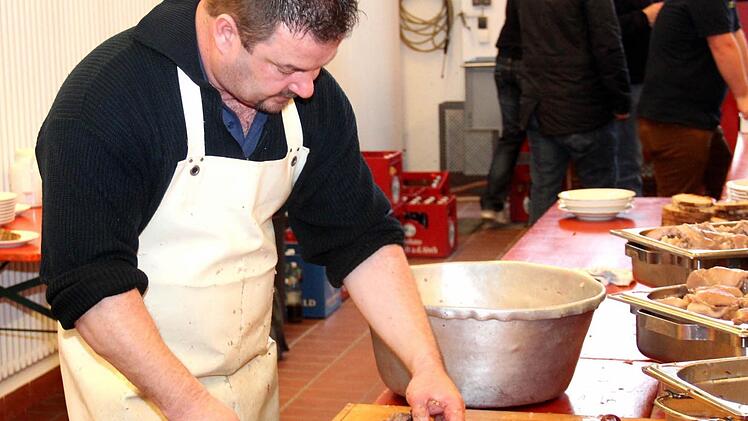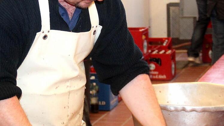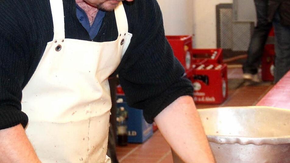 Die Adelsdorfer Rothelme sind stolz darauf, dass die vier Metzger aus ihren eigenen Reihen kommen. Harald Kraus, oder besser bekannt unter Harry, hat das Kommando. "Ich habe gestern schon alles eingekauft wie 65 Schweinsköpfe, 20 Zungen, 20 Herzen, 20 Nieren, 15 Ohrenbacken und mehr", erzählt Harry, während er die Zutaten für etwa 150 Leberwürste vermengt.
