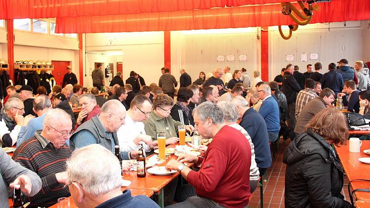 Auch die Feuerwehrkollegen des Patenvereins von Rottendorf sind regelmäßig zu Gast und sie genießen ihre Portion Kesselfleisch, zu der es immer einen Schnaps gibt. Auch Adelsdorfs neuer Kämmerer Christian Jakobs schaut vorbei. "Ich schau' mal, wie mir's schmeckt", meint er noch etwas skeptisch an der Essensausgabe.