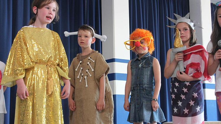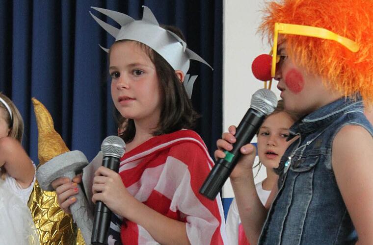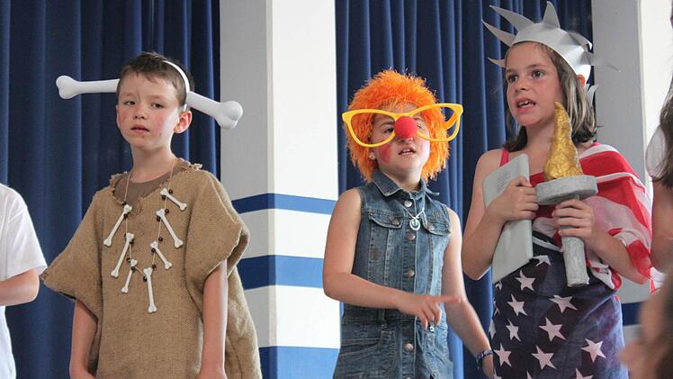 Musical von Rolf Zuckowski "Die Menschen wissen nicht einmal, was ein Tag eigentlich ist. 8. August, 10. Februar. Ihr gebt uns Zahlen, aber wer wir sind, wisst ihr nicht", heißt es  in der Einleitung zum Stück der Erst- und Zweitklässler. Im Musical "Der kleine Tag" von  Wolfram Eicke, Hans Niehaus und Rolf Zuckowski dreht sich alles um die verschiedenen Tage, die es so gibt. Große Tage, an denen Kontinente entdeckt und Erfindungen gemacht werden, Feiertage, an denen große Feste gefeiert werden, und traurige Tage, an denen ein Krieg ausbricht. Auf der Bühne stehen die Kleinen in bunten Verkleidungen. Jeder verkörpert einen dieser Tage. Der Kolumbustag als Freiheitsstatue, der komische Tag,  mit lustiger Brille und Perücke,  der Tag  an dem das Feuer entdeckt wurde in einem Steinzeitkstüm. Im Zentrum des Musicals steht aber der kleinste unter den Tagen, an dem nichts spektakuläres passiert. Er möchte auch einmal werden, wie einer der großen. Die Hauptrolle des kleinen Tages teilen sich die Zweitklässlerinnen Rebecca Horn und Lena Greber.  Im golden glänzenden Kostüm  fliegt der kleine Tag auf die Erde, um dort seine Erfahrungen zu machen.