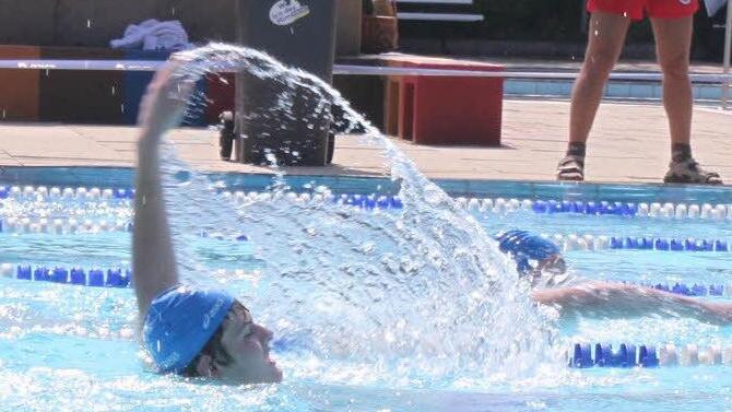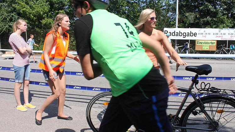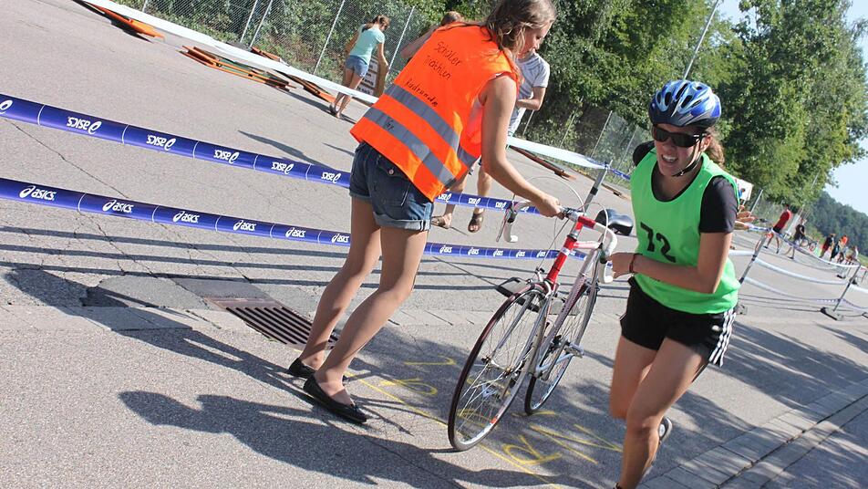 Rund um das Eisstadion herrscht eine bombastische Stimmung. Der Platz davor ist voll mit Kindern und Jugendlichen, die den Wettkampf  schon hinter sich haben. Drinnen, in der Halle, werden die Siegerehrungen durchgeführt (Ergebnisse siehe unten). Im Freibad warten am Beckenrand schon die nächsten Starter mit ihren blauen Mützen, bis die Gruppe vor ihnen das Becken verlässt. Eine Lehrerin am Megafon zählt den Countdown herunter. Vier, drei, zwei, eins:  Sofort spritzt das Wasser in den Bahnen des strahlend blau leuchtenden   50-Meter-Beckens. Die Arme fliegen. Dann raus aus dem Wasser. Die nassen Füße patschen über die Wiese, schnell die Übergabe an die Radler. Die Schwimmer sinken erschöpft schnaufend in die Wiese.