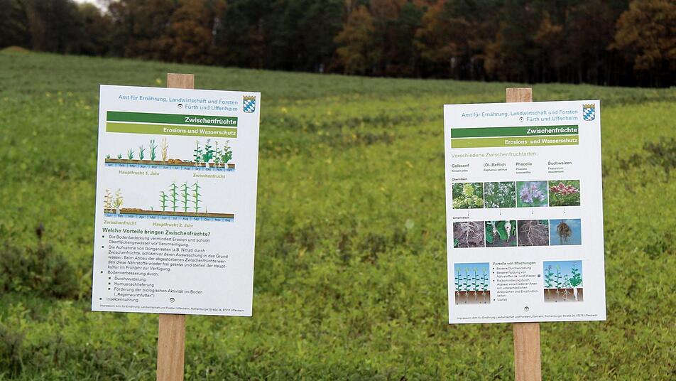 Vorbeifahrende haben sich auf der Verbindungsstraße zwischen Reinersdorf und Kairlindach sicher schon über die 13 weißen Schilder auf einem Feld gewundert. Dort legte Robert Ort, Kreisobmann des Kreisverbandes Erlangen-Höchstadt des Bayerischen Bauernverbands (BBV), eine Demonstrationsfläche für Zwischenfrüchte an. Jetzt hatte das Amt für Ernährung, Landwirtschaft und Forsten (AELF) in Fürth zu einer Begehung eingeladen. Nikolaus Ehnis und Anton Neumann vom AELF zeigten auf der Demonstrationsfläche die praktische Umsetzung von Gewässer- und Bodenschutzmaßnahmen. "Bodenfruchtbarkeit und Schutz vor Erosion sind wesentliche Punkte in der heutigen Landwirtschaft", erklärte Ehnis.