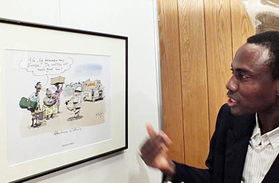 Für Bürgermeister Hacker ist die Ausstellung eine gelungene Aktion im Rahmen der Herzogenauracher Kulturtage des Jahres 2012. Bei der Ausstellungseröffnung dabei war auch Jean Désiré Sawadogo aus Kaya in Burkina Faso. Er studiert in Deutschland Philosophie und ist daher mit der Mentalität beider Kulturen vertraut. Sein Blick bleibt in der Ausstellung besonders an einer Karikatur von Burkhard Mohr hängen, die eine vierköpfige afrikanische Familie und einen Safaritouristen in Afrika zeigt. Während der Tourist die Landschaft und die Fauna interessiert, sind die Afrikaner mit all ihrer Habe bepackt. Die Karikatur mit dem Untertitel Abenteuer Wildnis hat die Textzeile: "Ach sie kommen aus Europa? Da wollten wir auch grad hin." Für Sawadogo ist sowohl der Tourist als auch die afrikanische Familie treffend charakterisiert, sie hat aber seiner Meinung nach zu wenige Kinder.