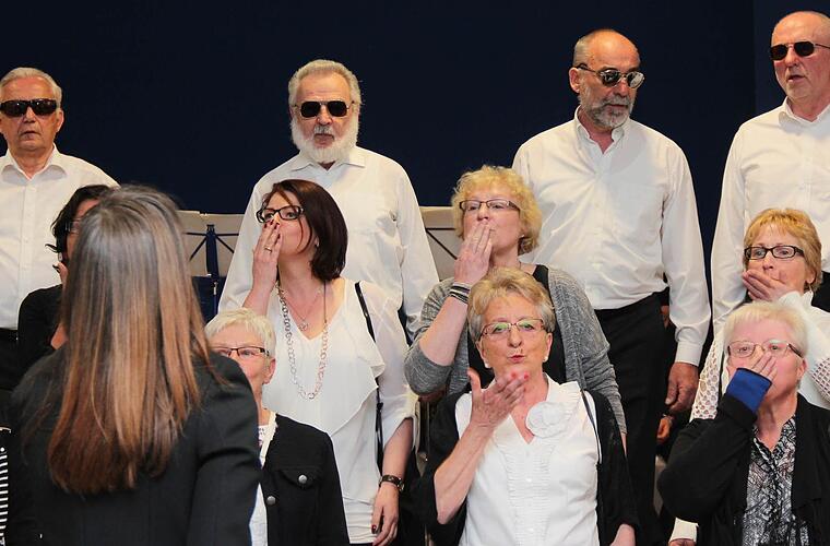 Der Chor der Waldeslust Zeckern (Leitung: Maria José Loza) bezauberte das Publikum mit dem gleichen Thema, "Rote Lippen soll man küssen", und erntete für diese gekonnte Darbietung Sonderapplaus. "Wie a Steech iebern diefn Wasser" (Simon/Garfunkel: "Bridge Over Troubled Water" - Text Helmut Haberkamm), dargeboten von der Gesangsgruppe Sing A-moll, erzeugte richtiges Gänsehautfeeling im Saal. Auch für den Song "Nur noch kurz die Welt retten", bei dem die Sänger mit Stimme und Mund selbst ihre Begleitung erzeugten, bekamen die Röttenbacher Sonderapplaus.