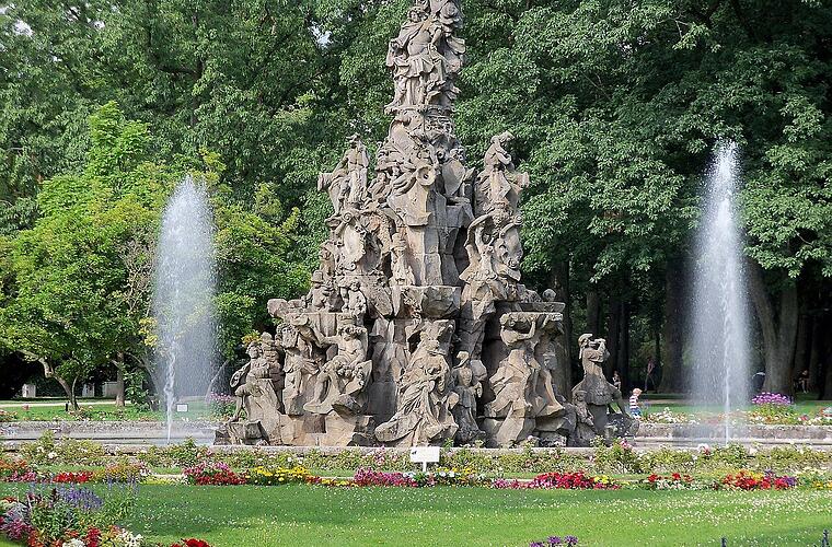 Der Hugenottenbrunnen im Erlanger Schlosspark ist ein tolles Fotomotiv und sehenswertes Kunstwerk. Er erzählt von der Ansiedlung der Hugenotten in Erlangen.