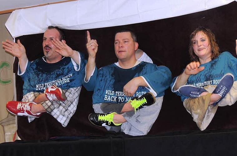 Huschka kündigte sie mit den Worten an: "Jetzt kommt etwas ganz Außergewöhnliches - wir konnten die Pantomimen-Gruppe ,Kleine Leute‘ engagieren!" Ein optischer Trick ließ Arme und Beine der drei Darsteller auf der Liliput-Bühne unabhängig von den Köpfen agieren. Das, was dabei herauskam, war ganz toll in Szene gesetzt und wirklich bühnenreif. Conférencier Huschka dankte den sechs Akteuren und dem Narren Harry Buisker, der den Einfall dazu und die Regie geführt hatte.