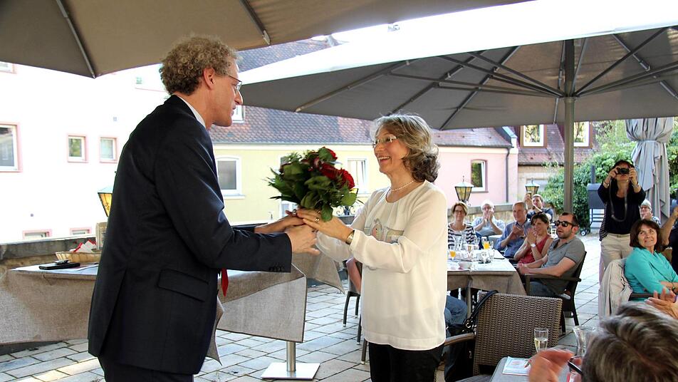 Mit einem Blumenstrauß bedankte sich Bürgermeister Hacker bei seiner Stellvertreterin, auf die er sich die zehn Jahre verlassen konnte und schnitt den großen Kuchen an.